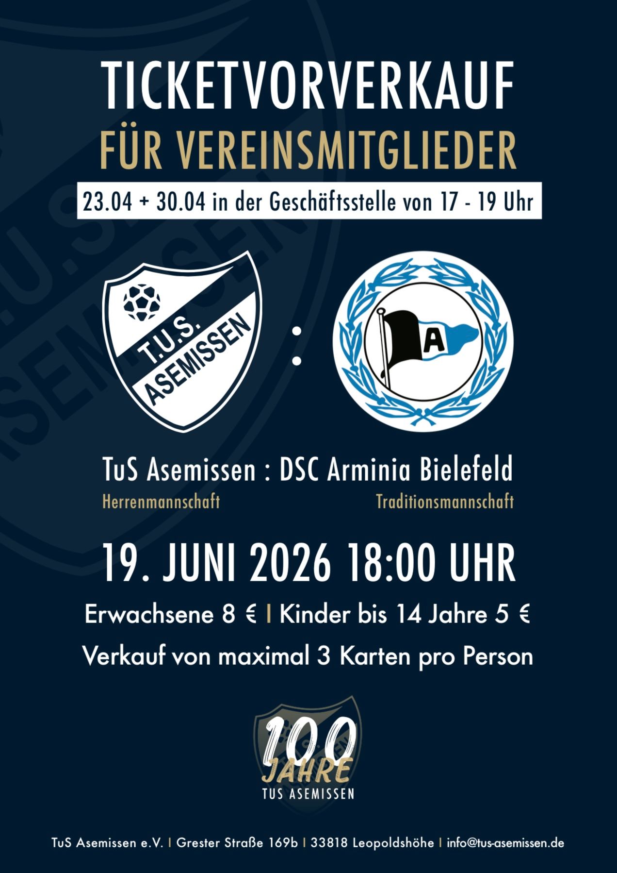 Um unseren Mitgliedern die Möglichkeit zu geben beim Spiel gegen die Traditionsmannschaft von Arminia Bielefeld dabei zu sein, wird es einen exklusiven Mitgliederverkauf geben. Am 23.04 und am 30.04 habt ihr die Möglichkeit, vorausgesetzt ihr seid Mitglieder, Karten in unserer Geschäftsstelle zu kaufen.